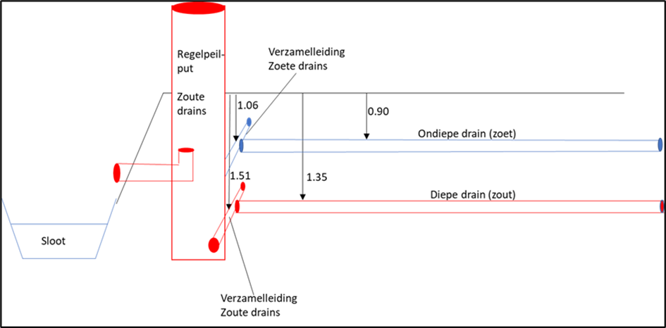 De peilgestuurde drainage moet in de toekomst het zoete regenwater zo lang mogelijk vasthouden in de bodem zodat het zoute grondwater naar beneden geduwd wordt. De dubbele drainage is toegepast op percelen waar de zoute kweldruk erg hoog is.